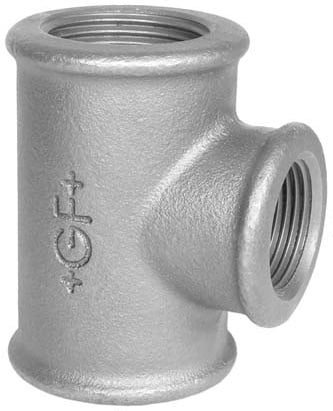 Bløtstøpt fitting av støpejern. Har innvendig gjenge i begge ender, samt forgreningen.