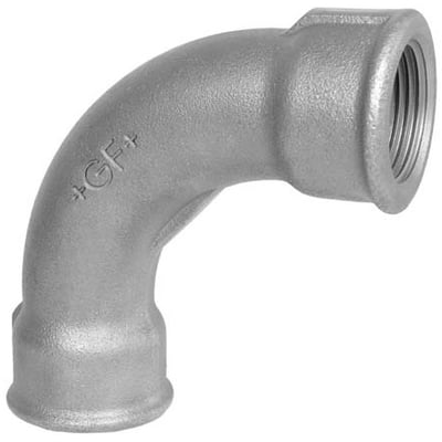 Bløtstøpt fitting av støpejern. Har innvendig gjenge i begge ender samt en vinkel på 90°. Bøyningen har stor radius.