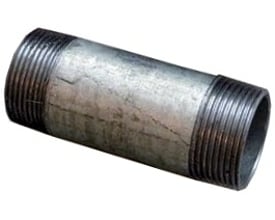142. Galvaniseret nippelrør i stål med R-gevind i begge ender, 40 mm langt og 1" i diameter.Galvanisert tønnenippel 40 mm, ᴿ1" x ᴿ1"