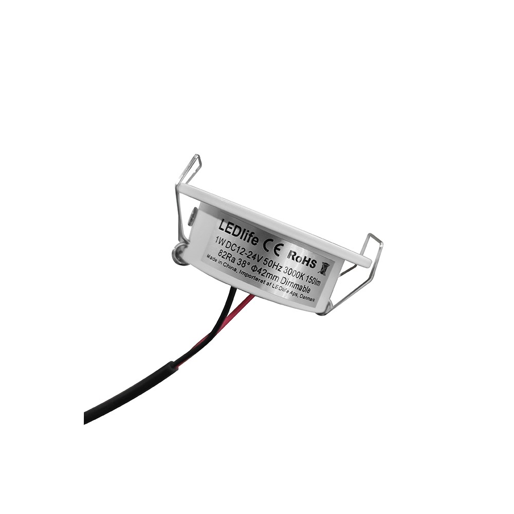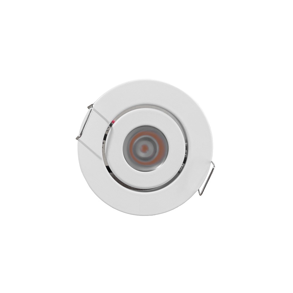 Dimbar 1W LED innfellingsspot i hvit med 3000K lysfarge, designet for 12V/24V installasjoner. Erstatter 15W og har en levetid på 30.000 timer. Ideell for fokusert belysning med et 38° spredningsfelt.