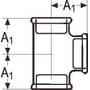 Georg Fischer galvaniseret tee T-stykke i støbejern med 90° afgrening og 3 x 2" indvendige gevindmuffer.Diagram af Georg Fischer tee T-stykke med angivelse af målinger (A1) for 2" x 2" x 2" dimensioner og 90° afgrening.