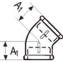 Georg Fischer galvaniseret vinkel fitting af støbejern med 45° bøjning og indvendige gevind i begge ender, ¾" x ¾".Skematisk tegning af Georg Fischer galvaniseret 45° vinkel fitting, der viser dimensionerne A1 og muffegevindene til rørforbindelser.