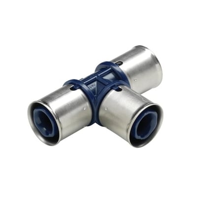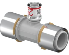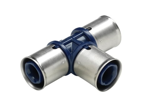 Presskobling som brukes til Tigris Alupex-rør fra Wavin. T-stykke med presskoblinger i begge ender og avgreningen.
