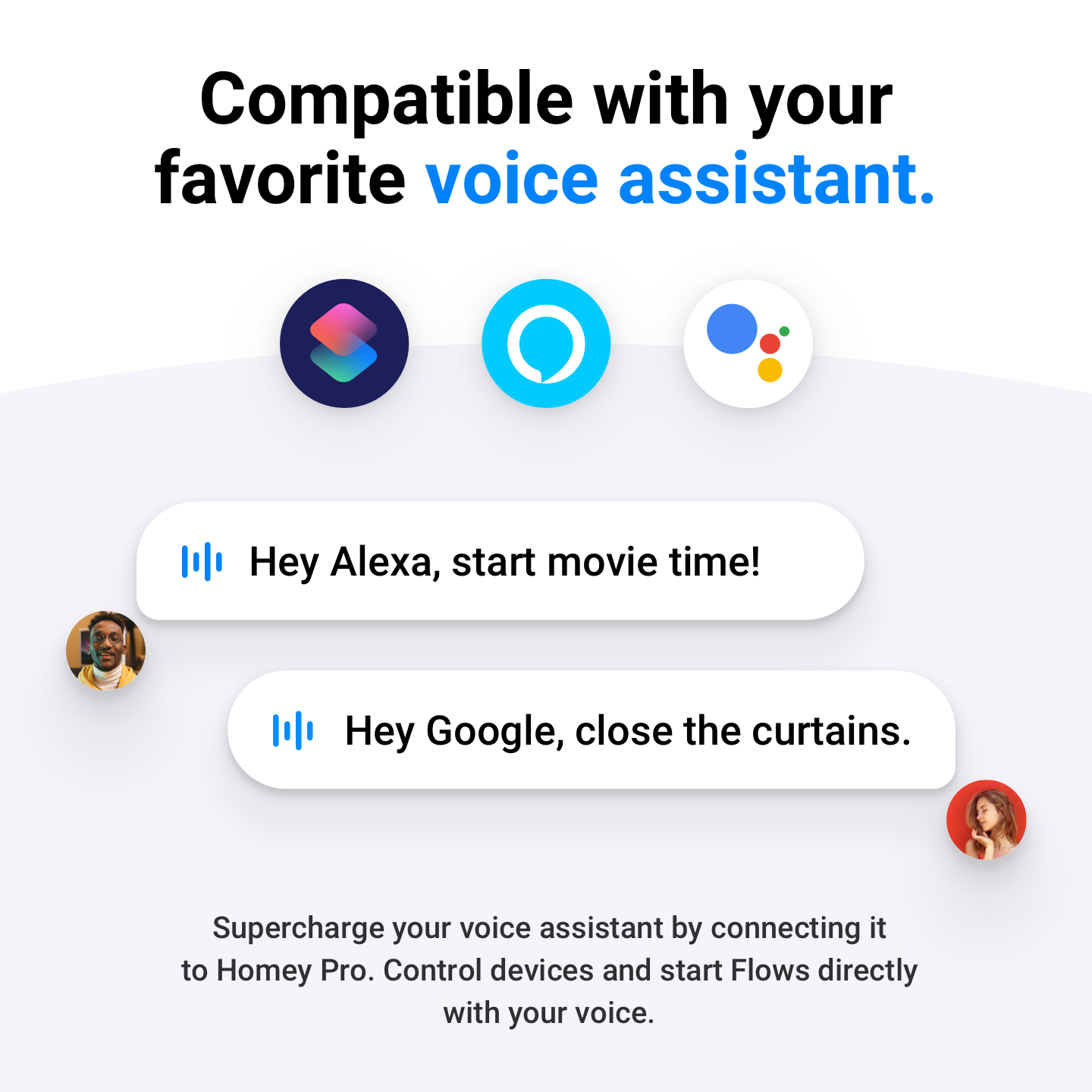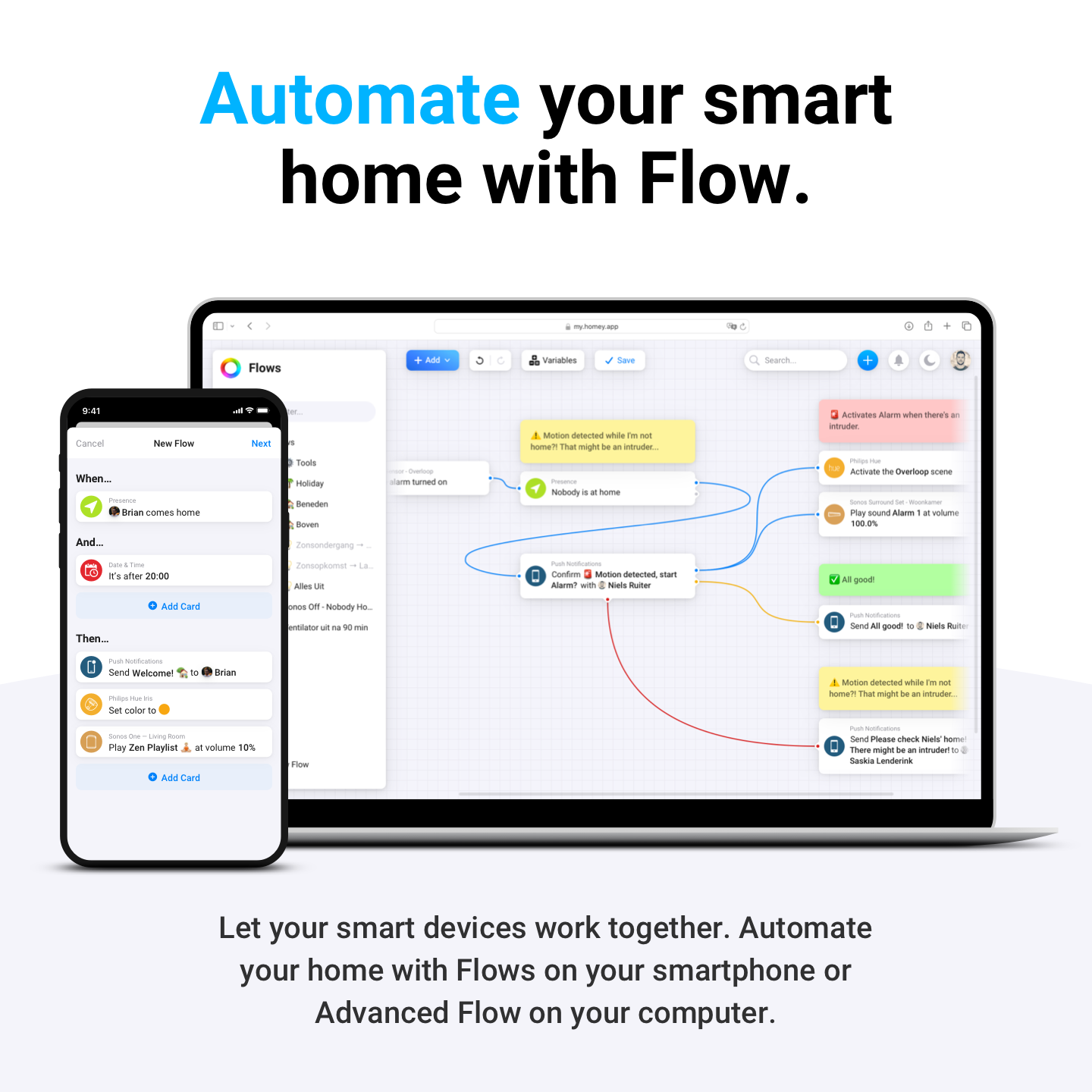 Homey Pro støtter over 50 000 enheter fra mer enn 1 000 forskjellige merker, noe som gir deg frihet til å velge de enhetene som passer best til ditt hjem og dine preferanser. Gjennom Homey-appen kan du enkelt opprette avanserte automatiseringer, også kjent som "Flows", som lar dine enheter samarbeide på intelligente måter.