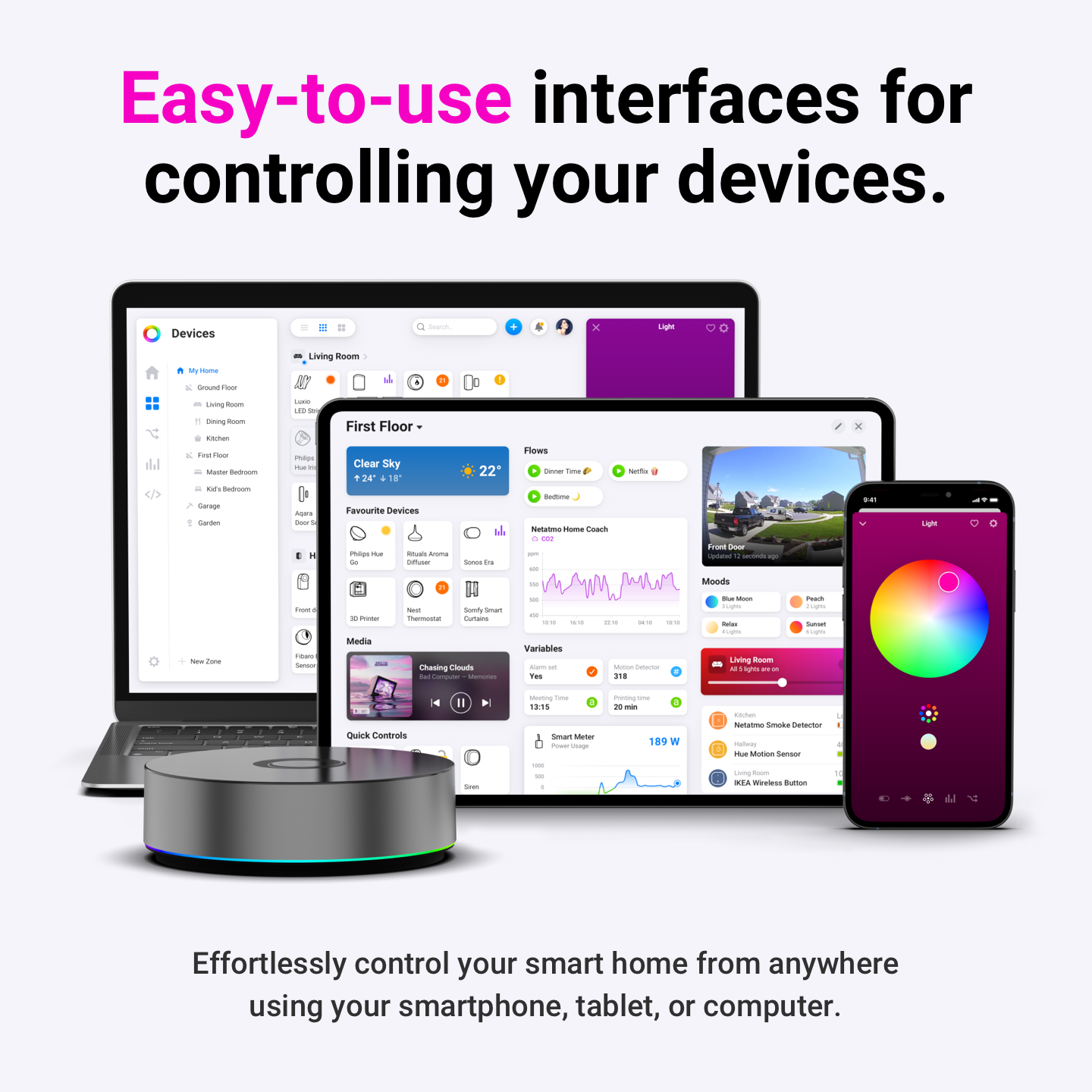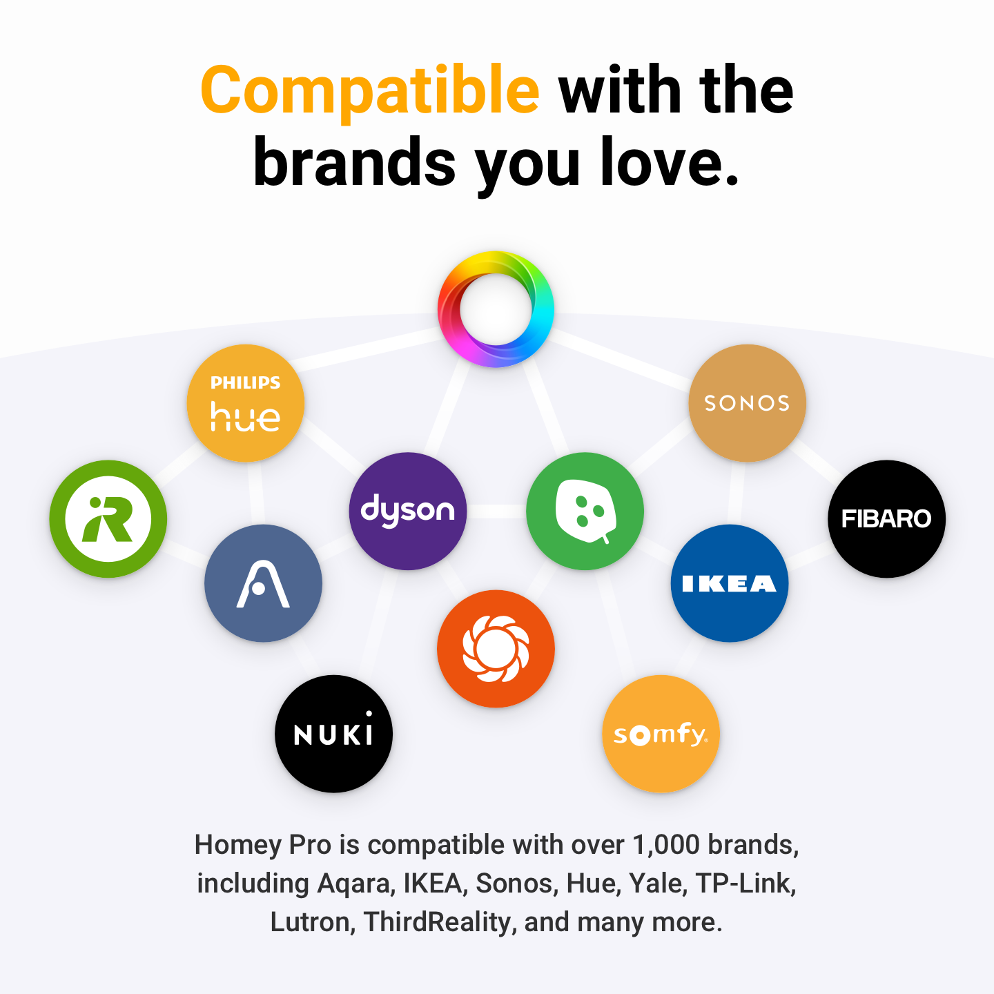 Homey Pro støtter over 50 000 enheter fra mer enn 1 000 forskjellige merker, noe som gir deg frihet til å velge de enhetene som passer best til ditt hjem og dine preferanser. Gjennom Homey-appen kan du enkelt opprette avanserte automatiseringer, også kjent som "Flows", som lar dine enheter samarbeide på intelligente måter.