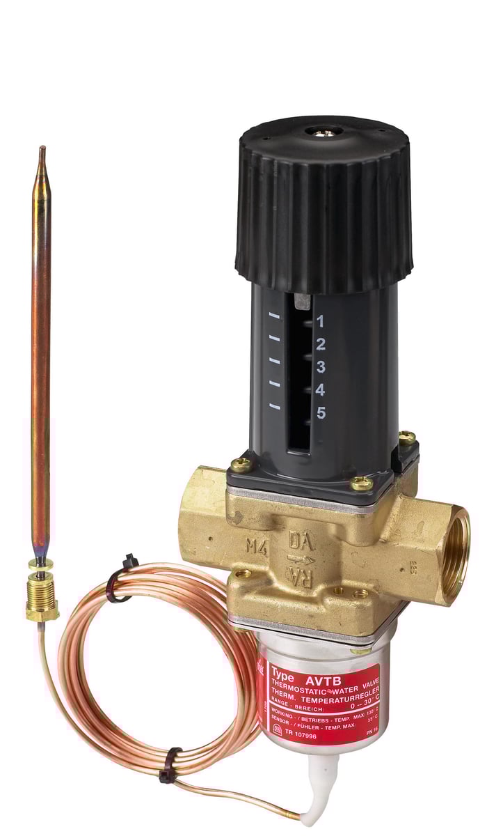 Danfoss AVTB er en selvvirkende temperaturregulator for varme tappevannskretser og varmekretser. Regulatoren brukes for temperaturregulering av varmtvannsberedere, gulvvarme, varmevekslere og oljeforvarmere. Den lukker ved stigende temperatur.