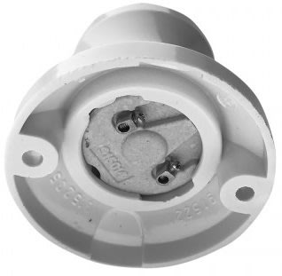 Vinklet bakelitt fatning til E27 pære. Fatningen er utført i hvit bakelitt og er egnet for montering i tak eller på vegg.