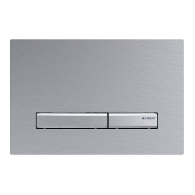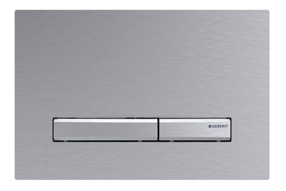Elegant Geberit Sigma50 betjeningsplate for dobbeltskyll. Betjeningsplaten er produsert i støpt sink og messing med en børstet krom overflate, som har et 'easy-to-clean'-belegg, som gjør rengjøringen enkel og effektiv.