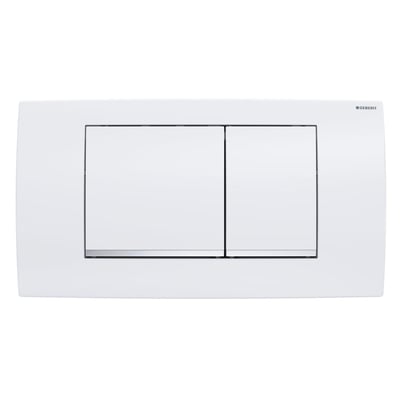 Betjeningsplate til Geberit Twinline innebygde sisterner. Denne modellen er designet for dobbeltskyll og betjenes frontalt. Den er produsert i alpe-hvit plast med blankforkrommede designstriper, som gir et stilrent utseende.
