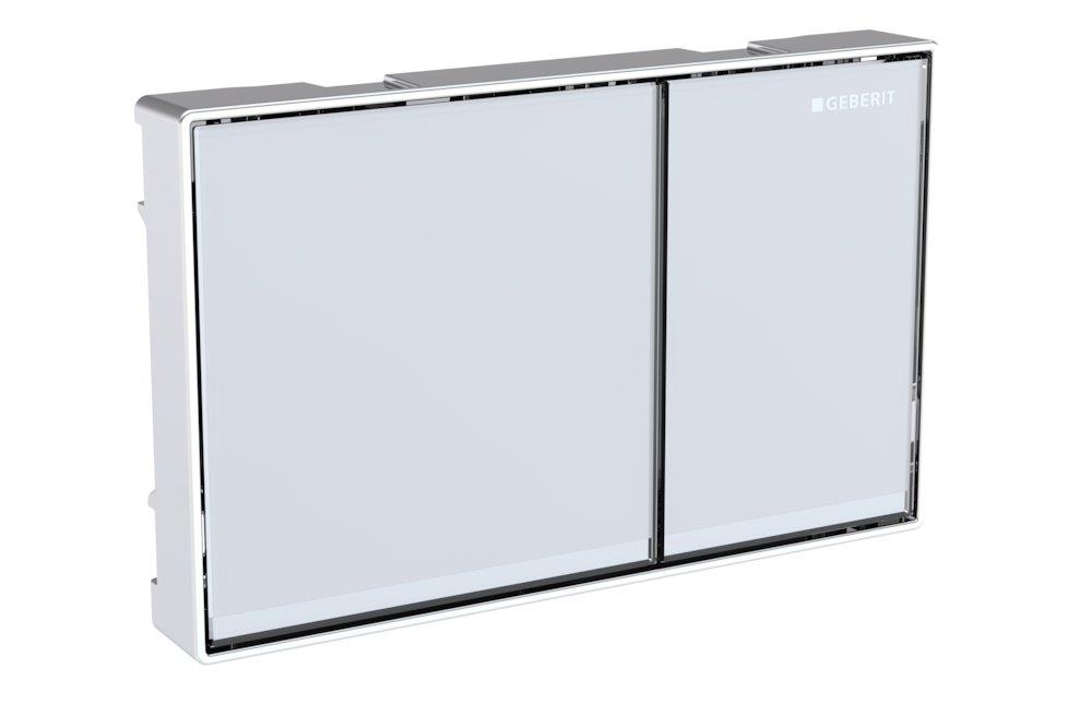 Elegant Geberit Omega60 betjeningsplate i hvitt glass for dobbeltskyll. Designet er kvadratisk med hvite knapper, speilglass designstriper og en blankforkrommet ramme, som gir et stilrent uttrykk.
