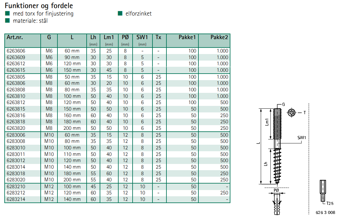 Walraven BIS ansatsskrue med M10 gevind på 40 mm og total længde 120 mm, elgalvaniseret stål med Torx T25 kærv.Teknisk tegning af Walraven BIS ansatsskrue, der viser dimensioner for L, Lm1, Lh, PØ, SW1 og TX25 kærv.Oversigt over Walraven BIS ansatsskruer med Torx T25 kærv og elforzinket materiale, inklusive dimensioner og pakningsstørrelser.