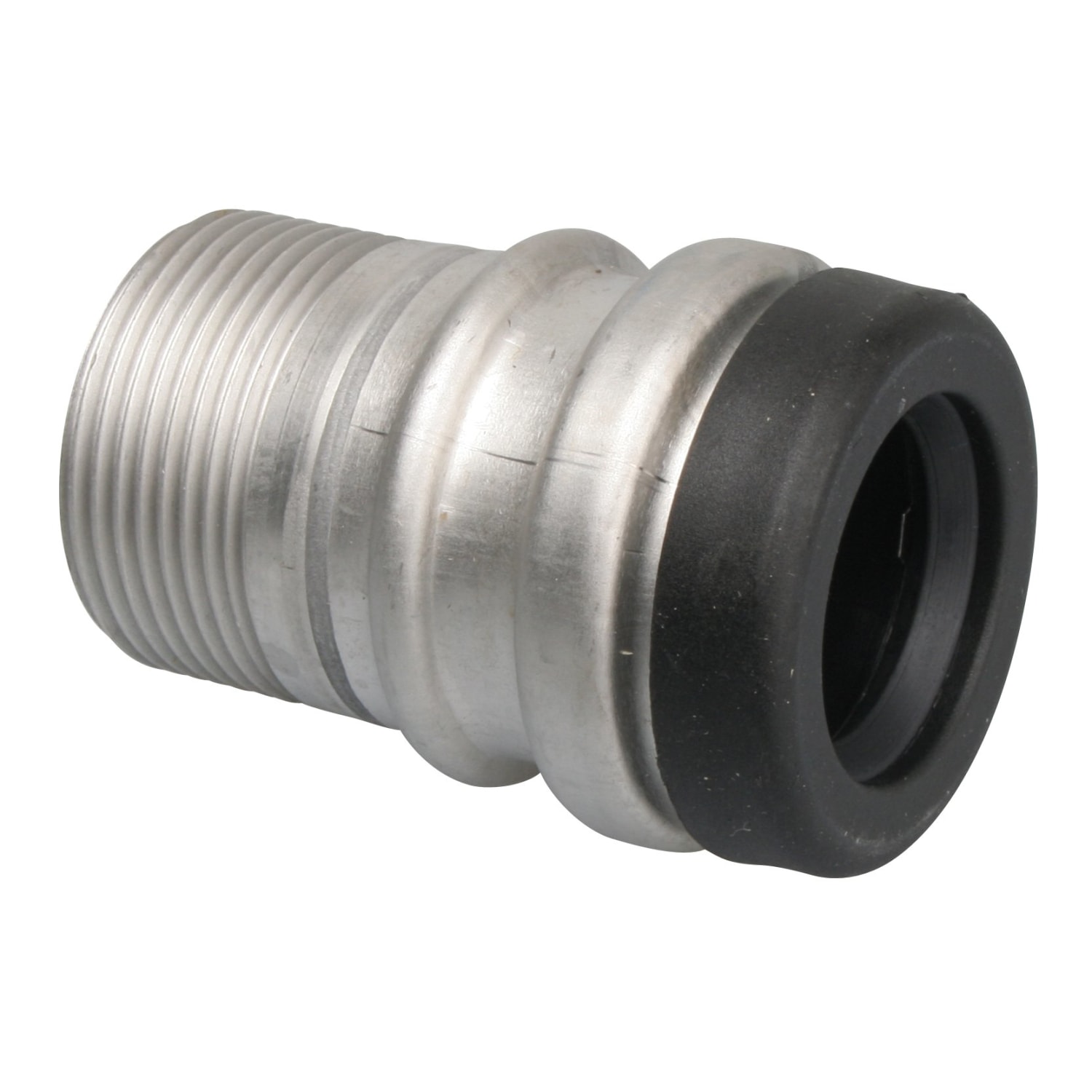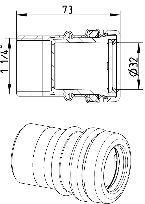 Overgangsnippel for gamle boligavløp med sideinnløp. Utløp: nippel 1.1/4". Produsert i rustfritt stål AISI 304/EN1.4301.