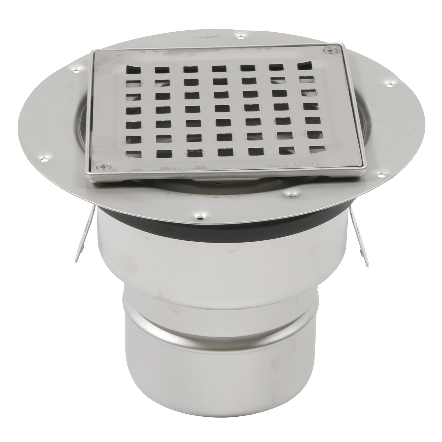 Blücher Square gulvsluk for betong og fliser med klemringmembran. Ramme: 145x145 mm, utløp: Ø110 mm vertikalt. Produsert i rustfritt stål AISI304/EN1.4301.