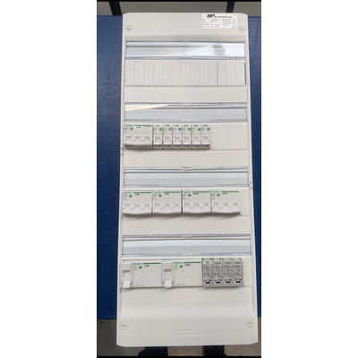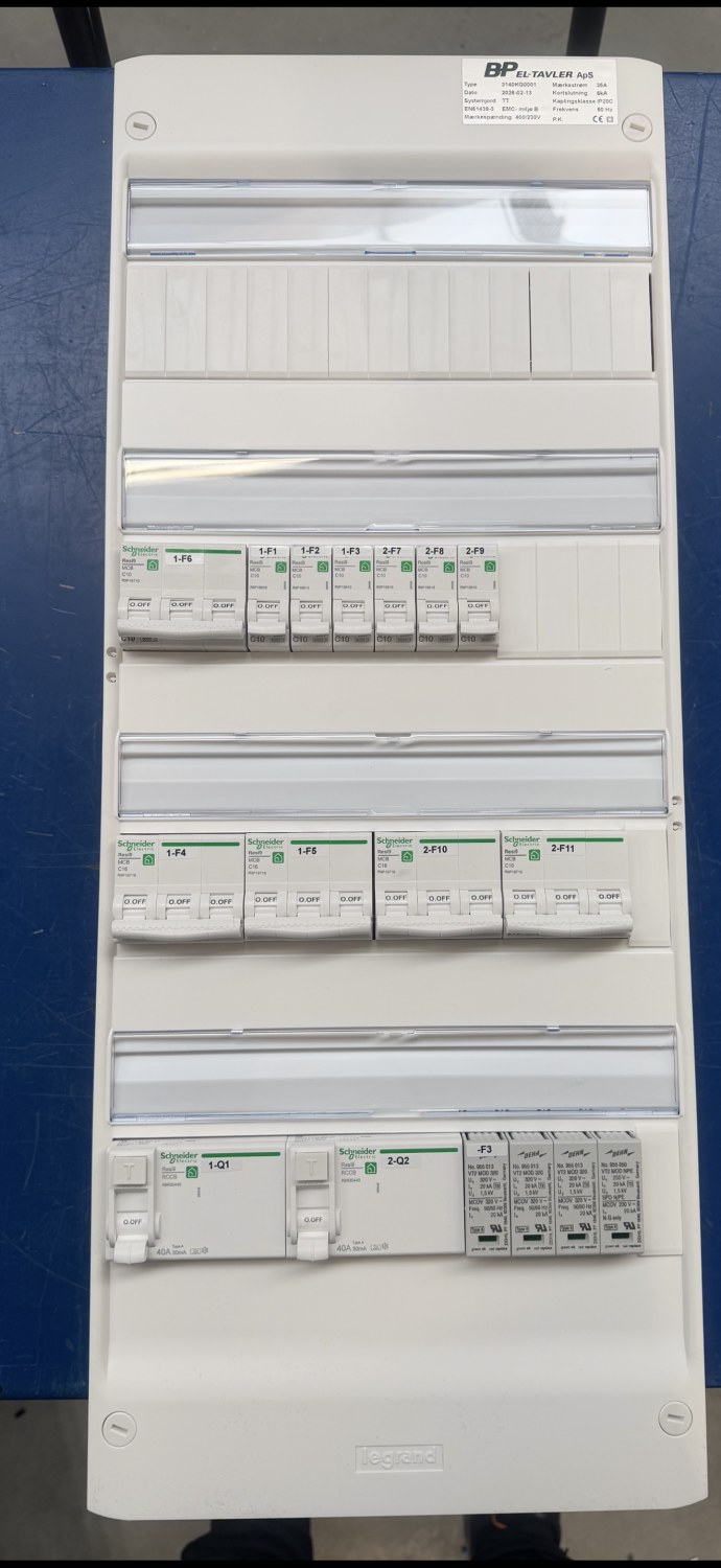 Legrand gruppetavle med 4 rader for påveggsmontering. Inkluderer Schneider-komponenter som transientbeskyttelse, jordfeilbryter og automatsikringer. Hvit farge og med 2 jordfeilbrytere type A.