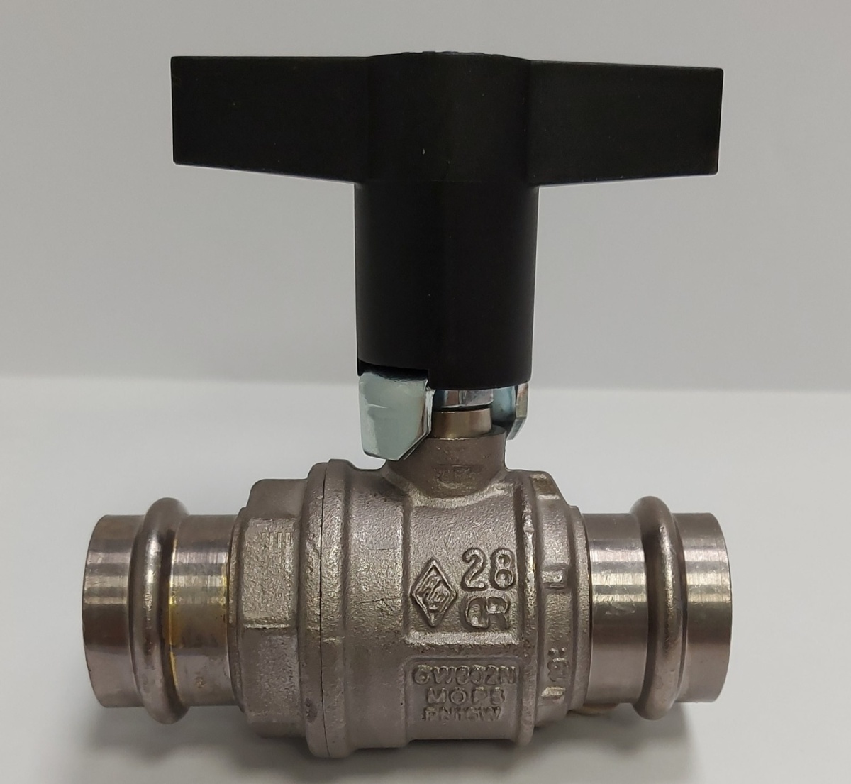 Bonomi presskuleventil med St-håndtak i høy modell og 28 mm diameter. Kan presses med M- og V-bakke opp til 35 mm (dog kun opp til 22 mm med minipressemaskin).