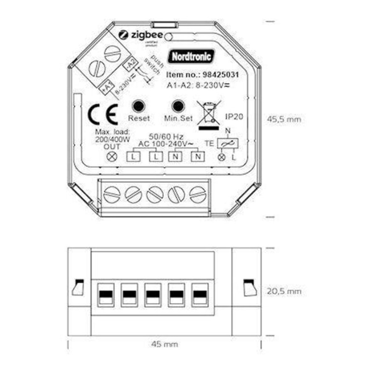 Super smart Zigbee dimmer fra Nordtronic. Kompakt størrelse gir mange muligheter - f.eks. i 68 mm PL-boks. Styres via Zigbee gateways med App. Kan også betjenes via 8-230V fjærtrykk. Kompatibel med Hue, Trådfri og Lightify/Smart+.