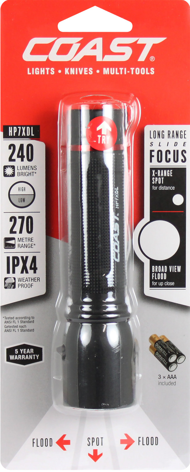 Coast HP7XDL er en lettvekts og robust lommelykt som er ideell for både hverdagsbruk og utendørs aktiviteter. Den er fremstilt i lettvektsplast og leverer et kraftig lys med en lysstyrke på 240 lumen.