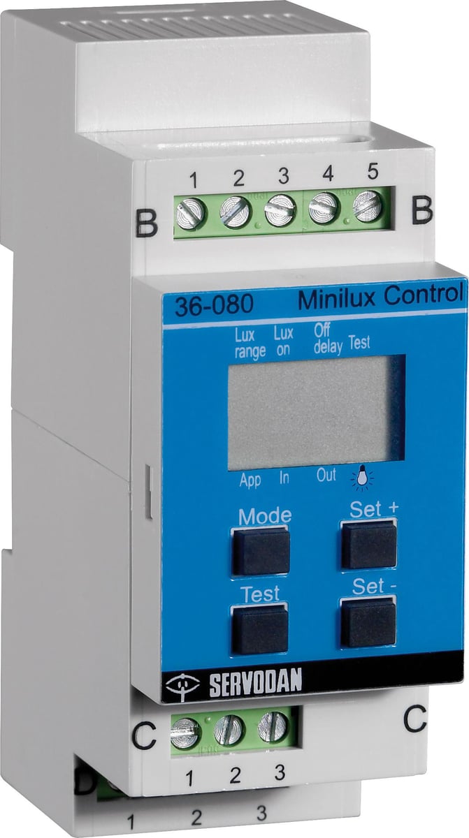Denne Minilux Control-enheten med display tilbyr avansert lysstyring for både innendørs og utendørs bruk. Med muligheten til å prioritere enten dagslys- eller bevegelsessensor, kan du skreddersy belysningen til dine spesifikke behov.