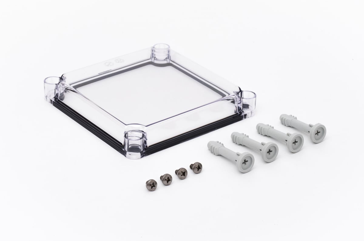 Dette transparente dekselet fra Fibox EK SOLID-serien måler 190x190x30mm og er laget av holdbart polykarbonat.