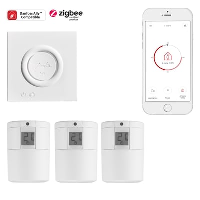 Danfoss Ally™ startpakke med 1 x Danfoss Ally™ gateway samt med 3 termostater (014G2460) Danfoss Ally™. Inkl. adaptere til RA, M30, RAV & RAVL ventiler.