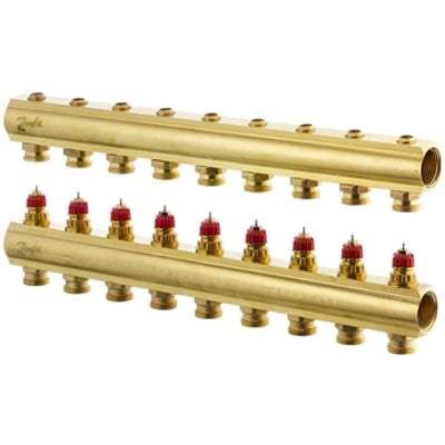 En del til Danfoss' gulvvarmemanifold FHF. Dette settet består av et frem- og et returløpsfordelerrør. Fremløpet gir mulighet for å lukke hver krets separat, og returløpet er utstyrt med Danfoss' forhåndsinnstillingsventiler som gjør innregulering enkelt. De kan forsynes med telestater. Avgreninger har gjenger for klemringskoblinger som bestilles separat i den nødvendige dimensjonen og rørtypen.