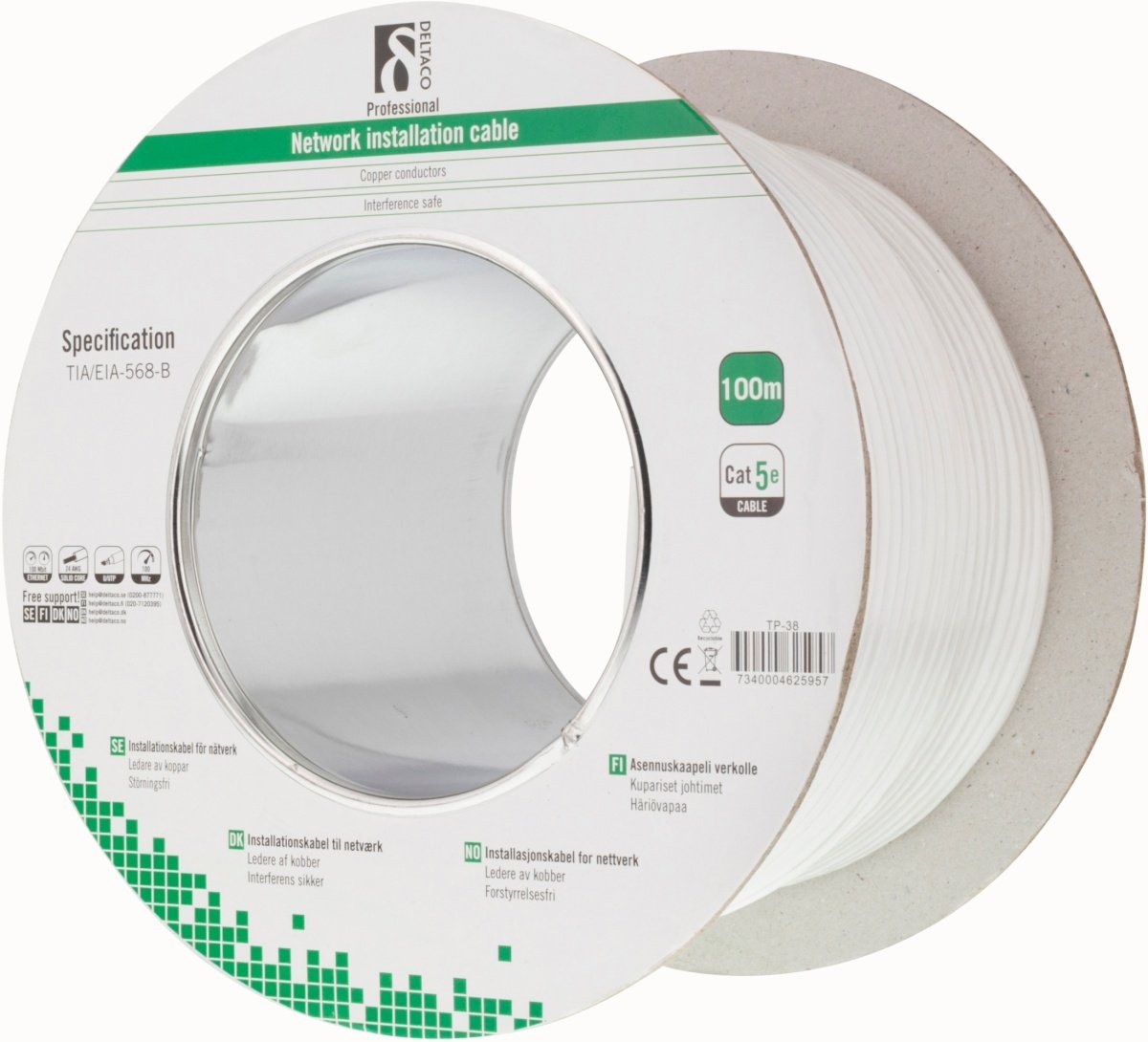 DELTACO U/UTP installasjonskabel, Cat5e, 100m rull, 100MHz, Delta-sertifisert, hvit.