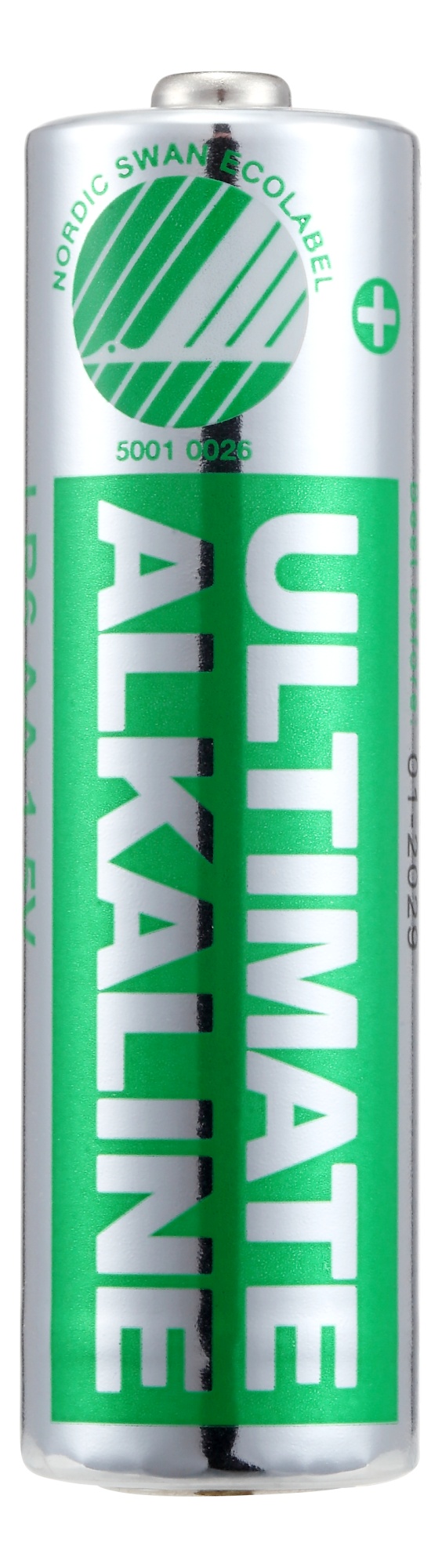 Svanemerket alkalisk AA-batteri på 1,5V til enheter med lavt til middels forbruk som fjernkontroller, digitale kameraer og leker.