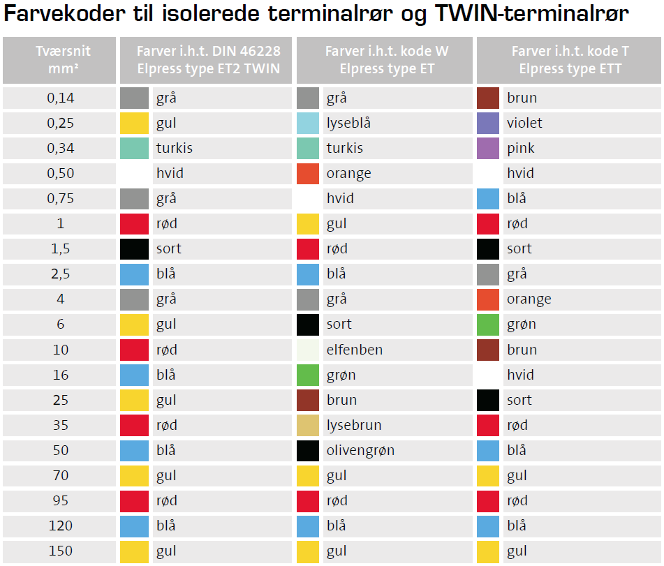 Elpress – Isolerte TWIN terminalhylser i mange dimensjoner og farger - Flere varianterElpress – Isolert TWIN terminalrør, 2 x 1,5 mm² / 8,0 mm, svart (fargekode TE)Elpress – Isolert TWIN terminalrør, 2 x 1,0 mm² / 8,0 mm, rød (fargekode TE) - 500 stkElpress – Isolert TWIN terminalrør, 2 x 0,75 mm² / 8,0 mm, blå (fargekode TE) - 500 stkElpress – Isolert TWIN terminalrør, 2 x 0,50 mm² / 8,0 mm, hvit (fargekode TE) - 500 stkElpress – Isolert TWIN terminalhylse, 2 x 1,5 mm² / 12,0 mm, svart (fargekode DIN46228) - 100 stkElpress – Isolert TWIN terminalrør, 2 x 0,75 mm² / 10,0 mm, blå (fargekode TE) - 500 stkElpress – Isolert TWIN terminalrør, 2 x 0,75 mm² / 12,0 mm, blå (fargekode TE) - 500 stkElpress – Isolert TWIN terminalrør, 2 x 1,0 mm² / 10,0 mm, rød (fargekode TE) - 500 stkElpress – Isolert TWIN terminalrør, 2 x 1,0 mm² / 12,0 mm, rød (fargekode TE) - 500 stkElpress – Isolert TWIN terminalrør, 2 x 1,5 mm² / 12,0 mm, svart (fargekode TE) - 500 stkElpress – Isolert TWIN terminalrør, 2 x 2,5 mm² / 10,0 mm, grått (fargekode TE) - 250 stkElpress – Isolert TWIN terminalrør, 2 x 2,5 mm² / 13,0 mm, grått (fargekode TE) - 250 stkElpress – Isolert TWIN terminalhylse, 2 x 4,0 mm² / 12,0 mm, oransje (fargekode TE) - 100 stkElpress – Isolert TWIN terminalhylse, 2 x 6,0 mm² / 14,0 mm, grønn (fargekode TE) - 100 stkElpress – Isolert TWIN terminalrør, 2 x 6,0 mm² / 18,0 mm, grønn (fargekode TE) - 100 stkElpress – Isolert TWIN terminalhylse, 2 x 10 mm² / 14,0 mm, brun (fargekode TE) - 100 stkElpress – Isolert TWIN terminallrør, 2 x 16 mm² / 16,0 mm, grønn (fargekode Weidmüller) - 50 stk