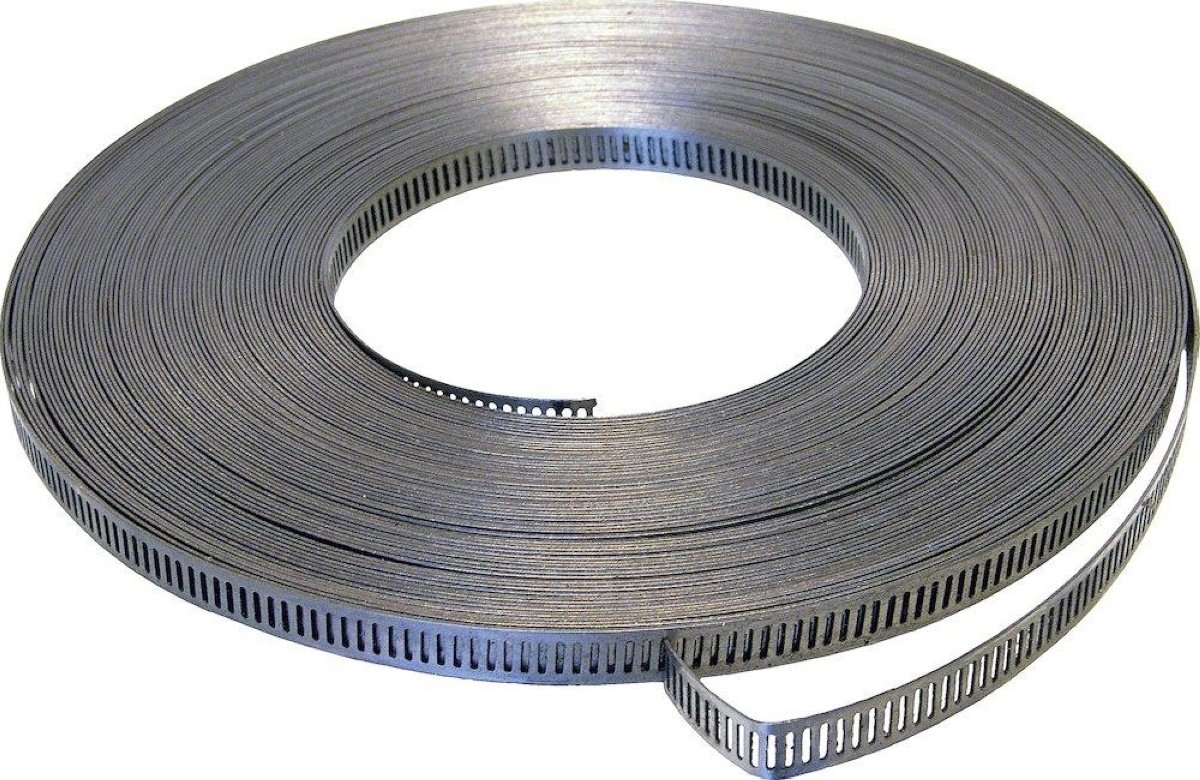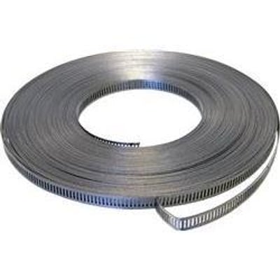Fleksibelt syrefast slangeklemmebånd på 3 meter med en båndbredde på 8 mm og 8 låser, ideelt for service- og vedlikeholdsoppgaver hvor du selv kan montere klemmene.