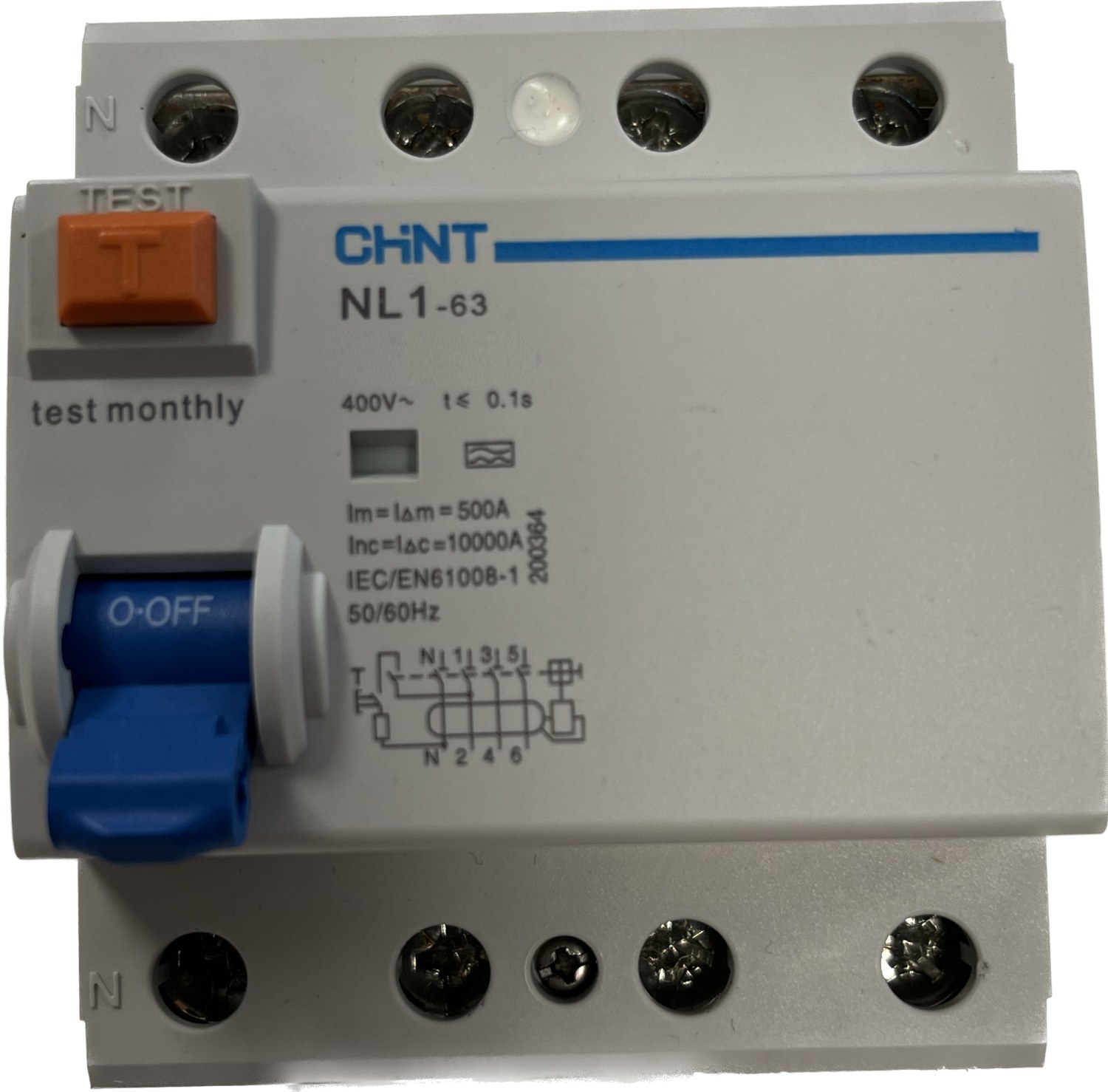 4-polet jordfeilbryter fra Chint med en utløserstrøm på 100mA og 63 Ampere.