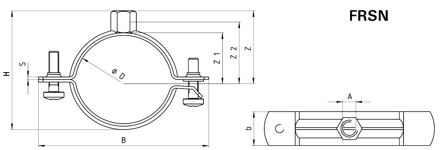 Todelt rørbøyle (type FRSN) uten gummiinnlegg. En del av Fischers SaMontec opphengssystem. Brukes til å bære stålrør, plastrør og andre typer rør. Forsynt med M8/M10 kombigjenge, som gjør det mulig å montere rørbøylen på gjengestenger av begge størrelser. Maks. belastning: 1500N.