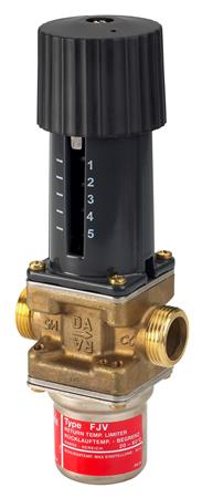 Returløpstermostat for automatisk regulering av returvanntemperaturen fra varmtvannsberedere som er direkte tilkoblet fjernvarmeanlegg, og fra blandekretser i fjernvarmeanlegg. FJV sikrer at returvannet er avkjølt til ønsket temperatur før det strømmer tilbake til fjernvarmeanlegget. Ventilen lukker ved stigende temperatur.