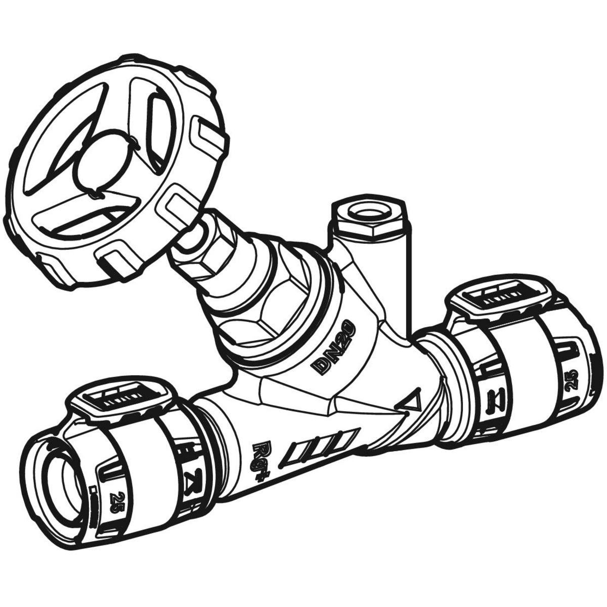 Geberit FlowFit avstengningsventil i rødgods med 16 mm diameter. Ventilhuset er fullt gjennomstrømmet og har vedlikeholdsfri spindeltetning.