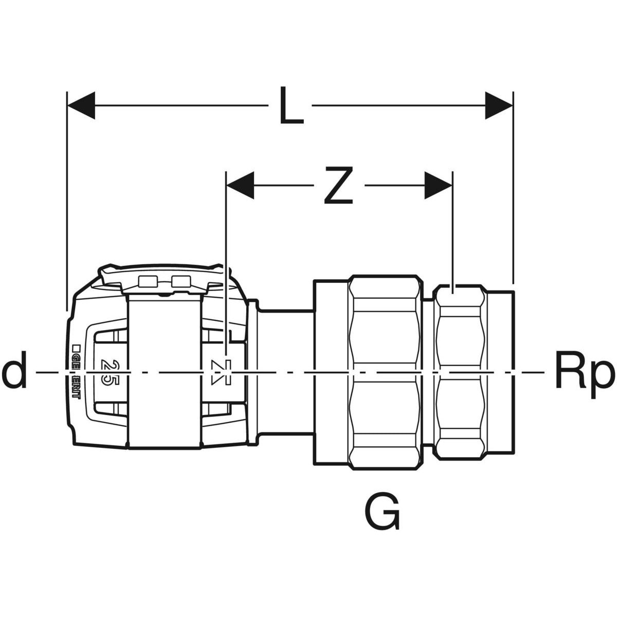 Geberit FlowFit union med innvendig gjenge: CuZn21Si3P, d=32 mm, Rp=1. Produsert i blyfri silisiumbronse.