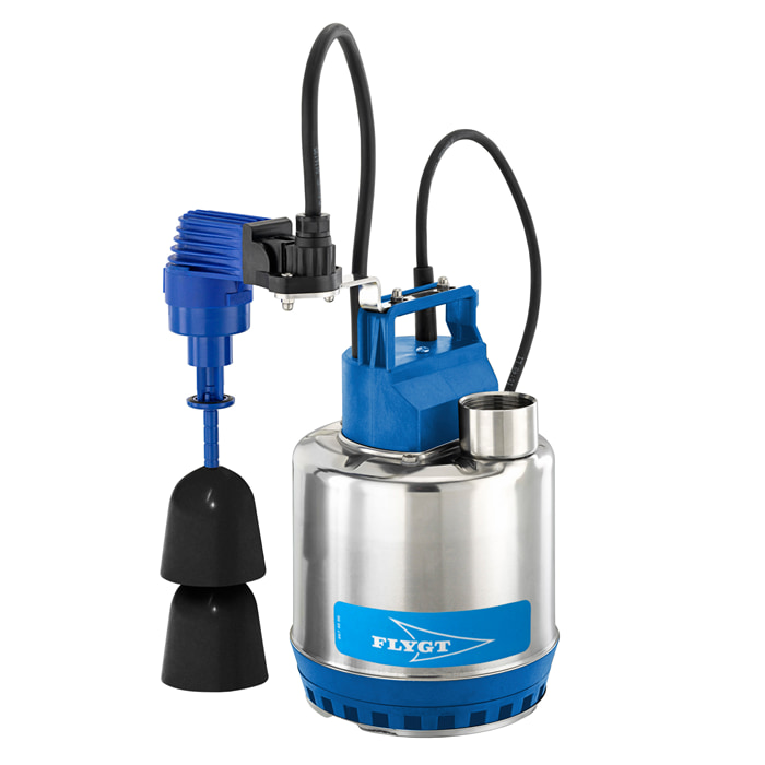 Flygt SX GW drenerings- og lensepumpe med nivåflottør-enhet, som er ideell for å pumpe grått spillvann fra for eksempel vaskemaskiner og vaskekjellere. Pumpen kan håndtere partikler opp til 10 mm.