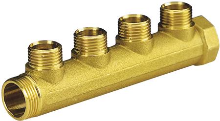 Fordelerør fra Pettinaroli i messing med 4 forgreninger. Ideelt for vann- og varmesystemer.
