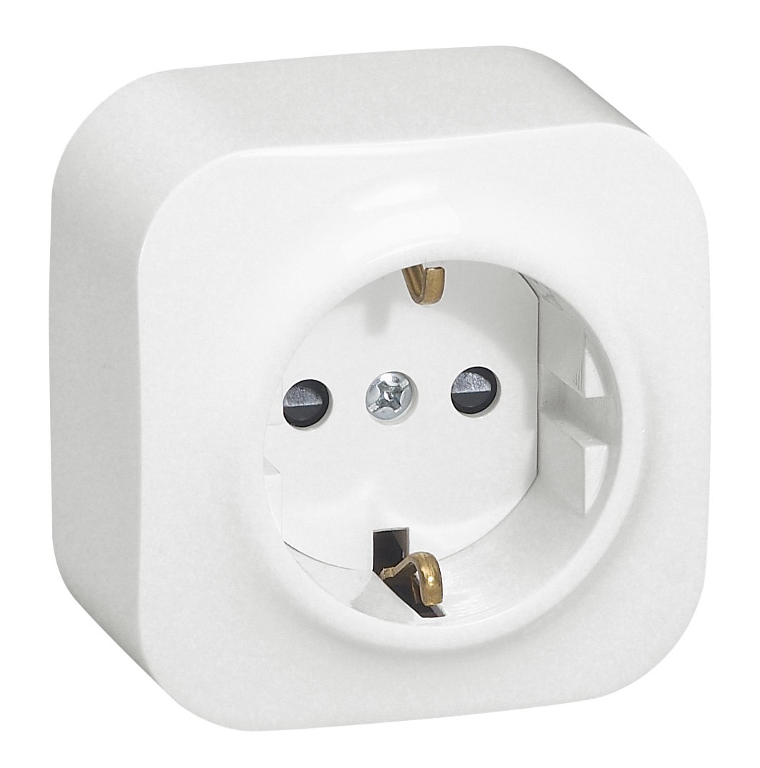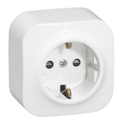 Enkel Schuko stikkontakt fra Forix Legrand i hvit, 16A, med sidejord og utvendig underlag. Ideell for innendørs bruk, f.eks. til hvitevarer.
