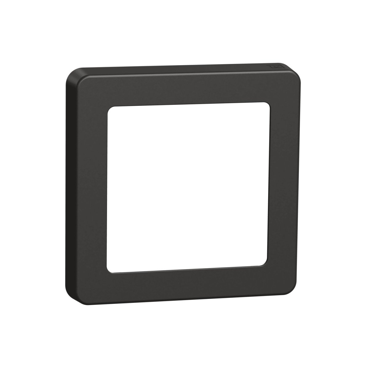 9. Lauritz Knudsen LK FUGA Pure designramme i sort glas til 1 modul, med en hvid firkantet åbning i midten og en mat sort kant.LK FUGA – Pure designramme, 1 modul, svart (glass) + teknisk monteringsramme