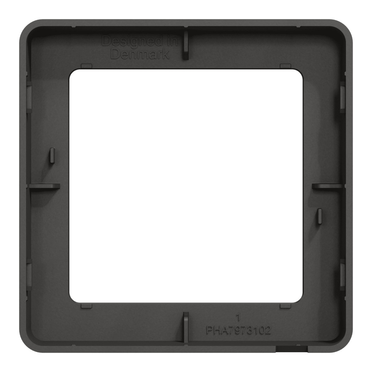 3. LK FUGA Base 63 designramme til 1x2 modul i koksgrå, vist med den udadvendte side mod beskueren.LK FUGA – Base 63 designramme, 1x2 modul, koksgrå