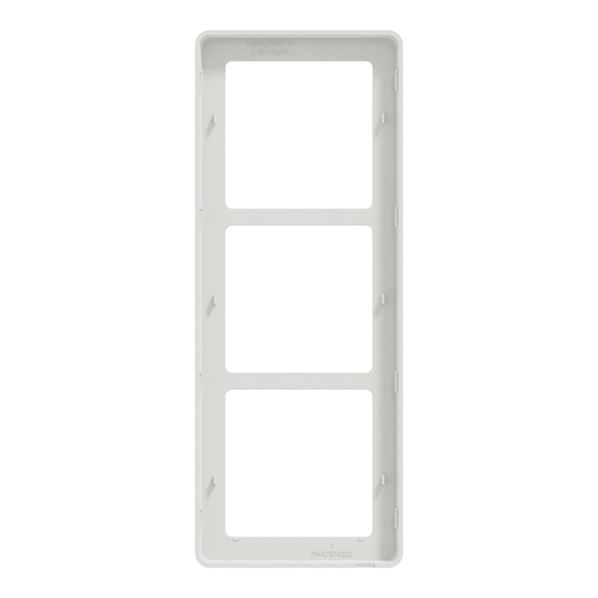 LK FUGA Base 63 design ramme til 3 moduler i hvid plast med tre åbninger på hvid baggrund.Sideprofil af LK FUGA Base 63 designramme i hvid, med diskret Lauritz Knudsen logo.Langsgående profil af LK FUGA Base 63 hvid designramme, set fra siden med afrundede kanter.LK FUGA Base 63 design ramme set fra forsiden med tre kvadratiske udskæringer, hvid.Bagside af LK FUGA Base 63 hvid designramme, viser monteringsclips og produktinformation.Lodret profil af en LK FUGA Base 63 hvid designramme, der fremhæver dens slanke design.Lodret visning af LK FUGA Base 63 hvid designramme, der viser dens rektangulære form og dybde.
