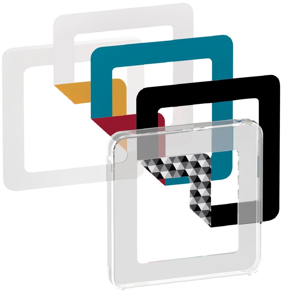 FUGA Choice designrammen i transparent leveres med 6 forskjellige fargeinnlegg, slik at du enkelt kan endre uttrykk og tilpasse rammen til din innredning. Fargevalgene inkluderer hvit, svart, petroleum (Pantone 314U), rød (Pantone 187C) og oransje (Pantone 129U). Rammen er designet for å brukes sammen med en teknisk monteringsramme (medfølger ikke).