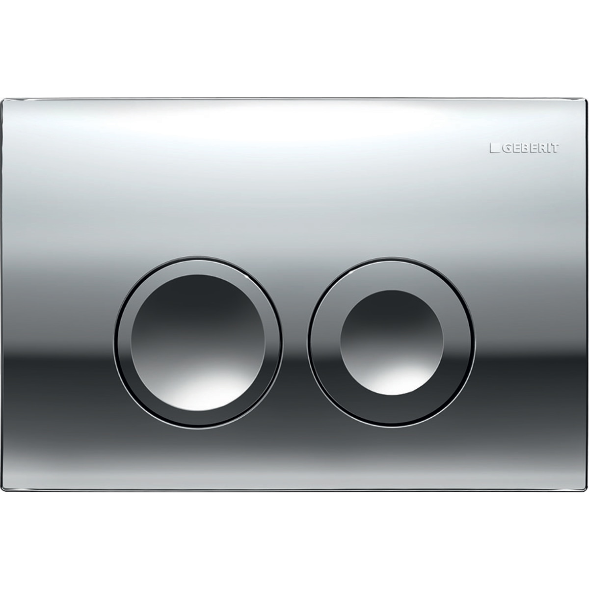 Geberit Delta25 betjeningsplate for dobbeltskyll. Blankforkrommet med frontbetjening. Passer til Delta innbyggingssisterner.