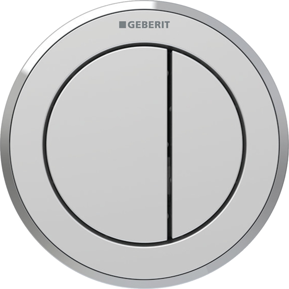 Geberit Type 10 fjernstyrt skyllebetjening for dobbeltskyll. Pneumatisk betjening med matt krom finish og "easy-to-clean" overflate. Kan kombineres med flere Geberit sisterner.