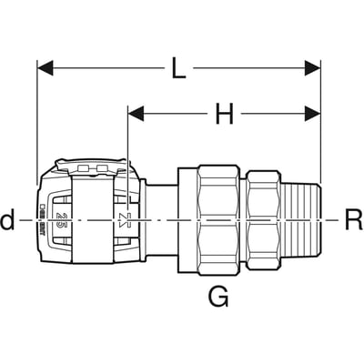 Geberit FlowFit union i blyfri silisiumbronse (CuZn21Si3P) med utvendig gjenge, dimensjon 16 mm x 1/2" x 3/4".