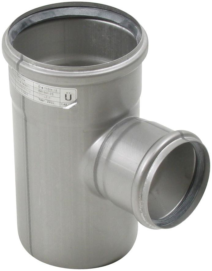Rustfritt Blücher EuroPipe grenrør med 87,5° forgrening. Diameter: 110/75 mm. Med muffer og O-ringer. Rustfritt stål: AISI304/EN1.4301.