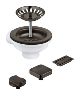 Bunnventil til kjøkkenvask i børstet hard graphite. Inkluderer dekkingsdel, overløpsdeksel, firkantet sil-deksel og rundt avløpssett-deksel. Manuell betjening.