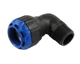 Kvalitets kobling fra Georg Fischer til PE-rør. Har kompresjonskoblinger i begge ender og er vinklet 90°. Den brukes til samling av rør med samme størrelse når de f.eks. skal føres rundt skarpe hjørner.