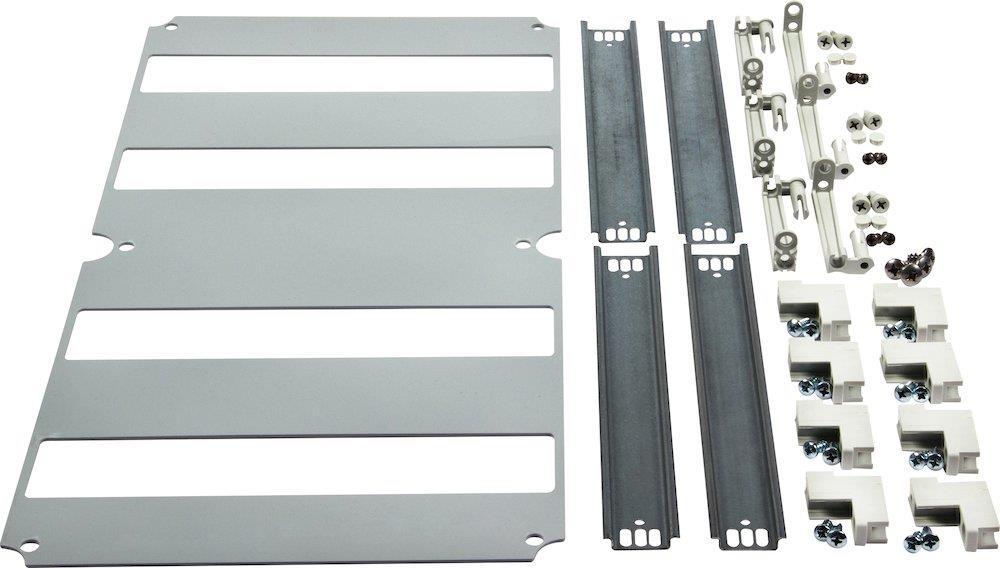 FIBOX EK Solid DIN-innsats leveres komplett inkl. avstandsstykker, DIN-skinner og dekkplate.