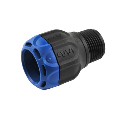 Isiflo Sprint overgang med 'Push-in' kobling til PE-rør. Produsert av et høyteknologisk komposittmateriale, som er glassfiberarmert polyamid, utviklet for høy styrke og lang levetid. Koblingen er korrosjonsfri og godkjent for drikkevann.