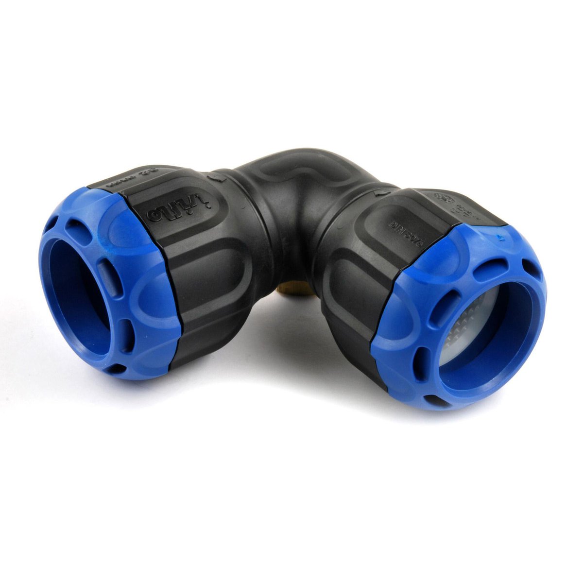 Isiflo Sprint vinkel med push-in kobling for PE-rør. Produsert av korrosjonsfritt komposittmateriale. Godkjent for drikkevann og sikrer en tett og strekkfast kobling.